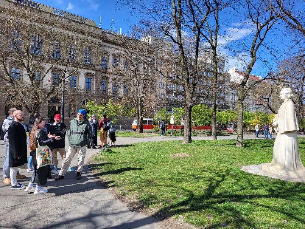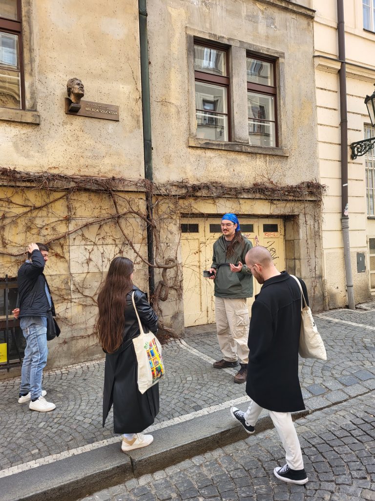 “The study trip and the exchange were divided into three parts: Firstly, students from the University of Nova Gorica, School of Humanities, and Charles University, Faculty of Arts, met for a captivating lecture on spring rituals and Easter customs. Dr Jasna Fakin Bajec led the discussion and gave insights into Slovenian traditions, while Dr Alenka Jensterle Doležal explained fascinating facets of Czech rituals. Later, the Slovenian students deepened their knowledge of cultural heritage and ethnographic research methods in another lecture by Dr Bajec. Next, we went on a study trip to Prague and immersed ourselves in the world of tourist guides. We learnt about the intricacies of cultural tourism and experienced both the challenges and the rewards. As we wandered through Prague’s architectural marvels, significant historical landmarks and Czech cuisine, we unravelled the rich fabric of the city. From Charles Bridge to Prague Castle, from Lenin’s Wall to Wenceslas Square, every corner revealed a story. We explored the history of Charles University, the charm of the Old Town and the splendour of Vyšehrad and experienced the essence of Prague first hand.the third part was a poignant exploration of Slovenian and Czech women writers. We paid homage to literary luminaries such as Zofka Kveder, Božena Nemcova, Karolina Svetla and Eliška Krasnohorska. I had the privilege of presenting Karolina Svetla’s legacy to my group and providing insights into her life and work during a visit to her resting place. In Vyšehrad, we paid our respects to the important figures of Czech literature at the cemetery. We also attended the opening of the exhibition “Slovenian Modernism in the Czech Environment” and witnessed the unveiling of a memorial plaque dedicated to Zofka Kveder. To summarise, on our trip we were able to take on the role of tourist guides and gain deep insights into Prague. Through these experiences, we built a deeper connection with the city and its cultural heritage and enriched our understanding and appreciation of the city’s intricacies.